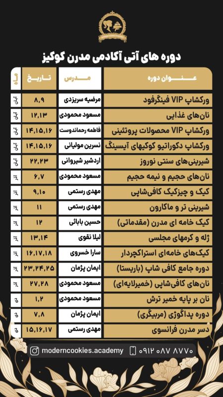 آکادمی مدرن کوکیز برترین برگزار کننده دوره های تخصصی قنادی با برگزاری ورکشاپ های حرفه ای و بین المللی با حضور استادان برجسته ی ایران و بین المللی در خدمت علاقه مندان و پیشروان این صنعت در ایران می باشد .